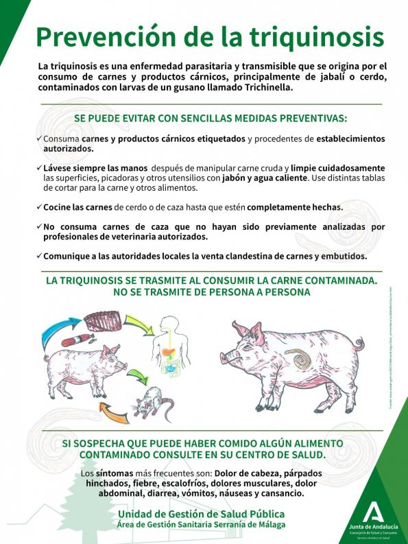 05/05/2025. Material informativo (díptico y cartel) sobre la prevención de la TRIQUINOSIS, elaborado por la Unidad de Gestión de Salud Pública del Área de Gestión Sanitaria Serranía de Málaga del Servicio Andaluz de Salud.