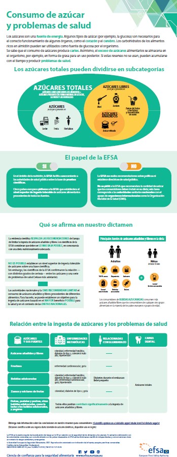 Con la información evaluada no se ha podido fijar un nivel máximo de ingesta diaria de azúcares procedente de los alimentos que, al respetarse, excluya la posibilidad de presentar un riesgo de efectos adversos para la salud de las personas, por lo que siempre debe ser la menor posible. Se adjunta infografía (abajo, en "Descargar") sobre el consumo de azúcar y sus problemas derivados.